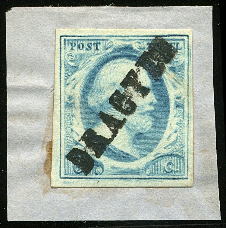 Naamstempel DRAGTEN (EY.100) op 5 cent nr. 1l-Pl.IV-45. Prachtex. op briefstukje met volledige afst. Cert. ´Balasse, 1977´