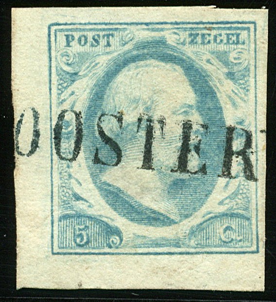 Naamstempel OOSTERWOLDE in zwartblauw (EY.100) op 5 cent nr. 1l-Pl.IV-46. Breed gerand pracht hoekstuk met scherpe afst.