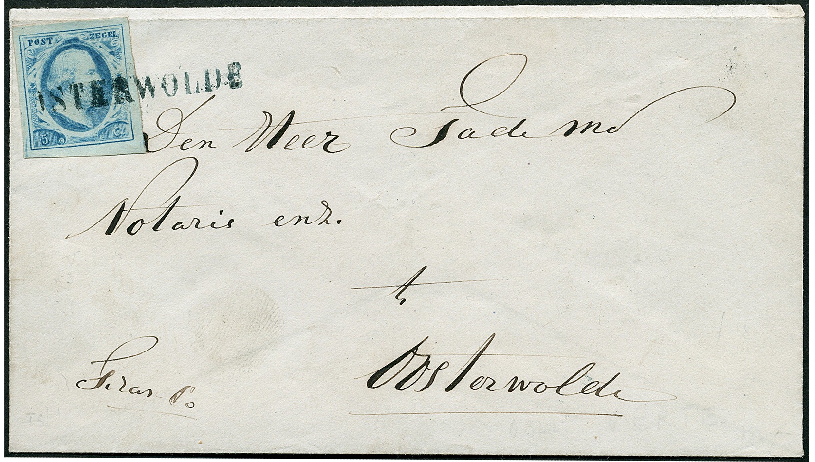 Naamstempel OOSTERWOLDE in blauw op 5 cent. Zeer breed gerand prachtzegel op lokaal/regionaal verz. couvert met op az. eveneens afdruk van dit stempel