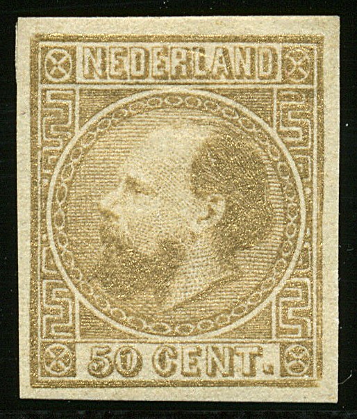 12IIv, 50 Cent goudkleur, ongetand, gegomd met vrij stevige plakkerrest, overigens prachtex. en mooi van kleur. € 800