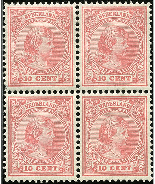 37, 10 cent roze in postfris blok van vier, boven iets los, 1 wrd. zeer fraai, ov. ex. pracht € 800