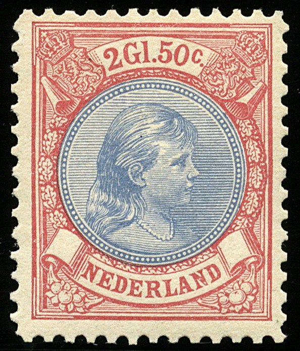 47A, 2½ Gulden wijnrood en lichtblauw, Lt. 11½, postfris prachtstuk met cert. NVPH (1995) € 4000