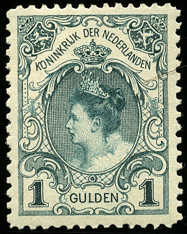 49, 1 Gulden blauwgroen, Lt. 11½ x 11, zgn. Kroningsgulden, postfris prachtex. met cert. Vleeming (2009) € 1500