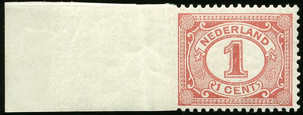51v, 1 cent rood met variëteit: linkerzijde ongeperforeerd, ongebr. pr.ex. met minimaal plakkerrestje op velrand € 550