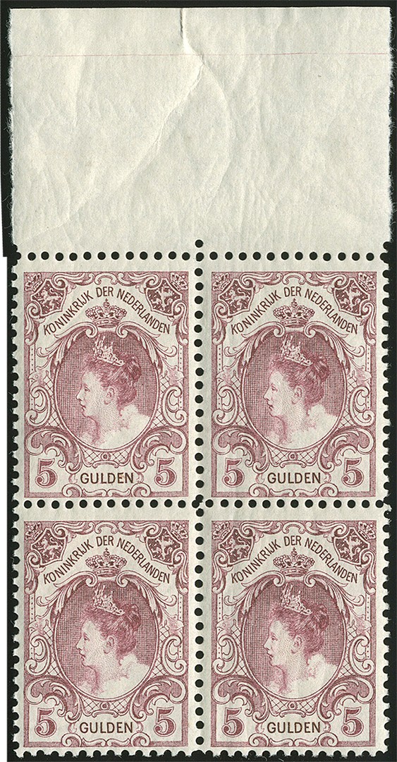 79A, 5 Gulden wijnrood, Lt. 11, in luxe postfris blok van vier met bovenvelrand en cert. NKD (2017) € 4000