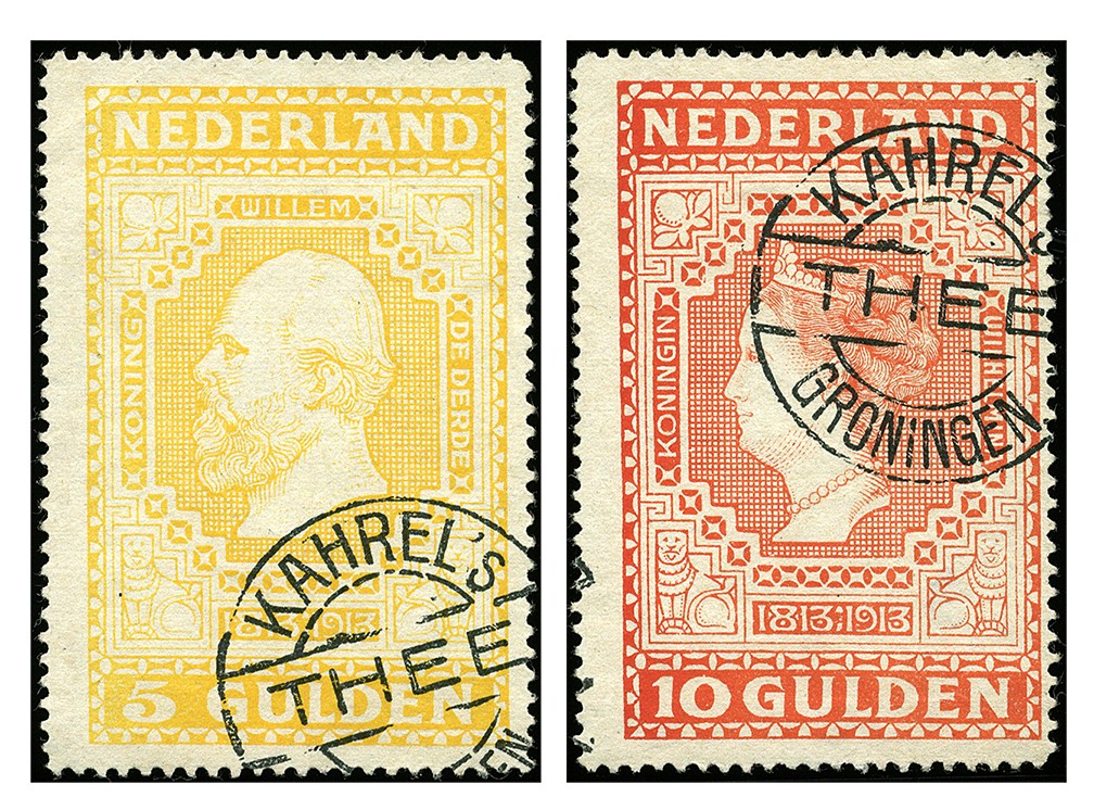 2½ Cent t/m 10 Gulden Jubileum 1913, complete set Vignetten van 12 stuks met reclamestempel 'Kahrels Thee Groningen', leuk geheel!