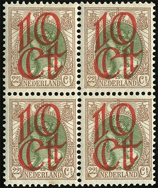 120, 10 op 22½ cent in postfris blok van vier waarin plaatfout 120 PM13 (linksboven) pracht, en plaatfout 120 PM5 (linksonder) fraai