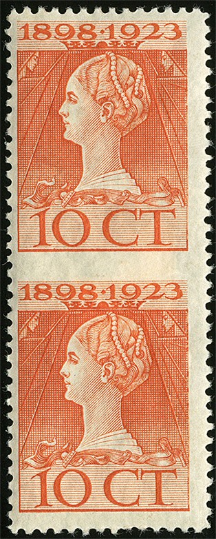 124Fv, 10 cent oranjerood in verticaal paar tussen de zegels ongeperforeerd, ongebruikt zeer fraai ex. met papier plakkerrest en onder klein tandinggebrek € 725
