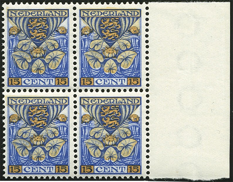 202a, 15 + 3 cent geel en blauw met verticaal watermerk, in postfris minimaal getint blok van vier € 800