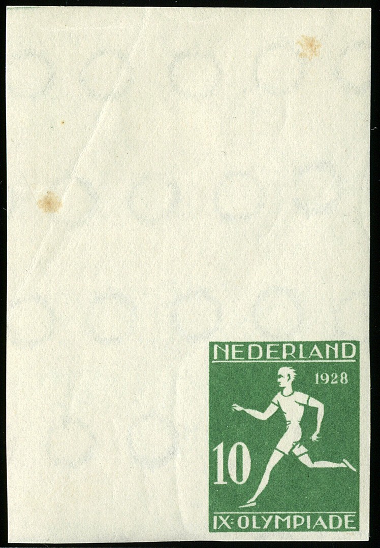 Olympische Spelen 1928. Ongetande kleurproef van de 10 cent in groen op papier met watermerk, geknipt uit velletje, PC.242a. Twee bruine puntjes en hoekvouwtje linksboven, tevens plakkerspoortje, alles ver buiten zegelbeeld, welke van prachtkwaliteit en postfris is. Cert. ´Muis, 1996´. Zeer zelden aangeboden! Fl. 850
