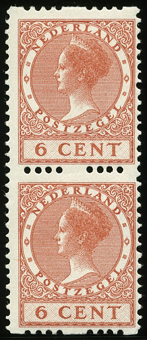 7, 6 cent zonder watermerk, postfris verticaal paar, prachtex. € 450