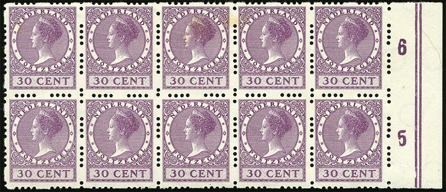 53c, 30 Cent met afwijkende tanding tussen de zegels verticaal, in postfris veldeel van tien (enkele minieme bruine vlekjes). Ex De Gruyter. € 1600