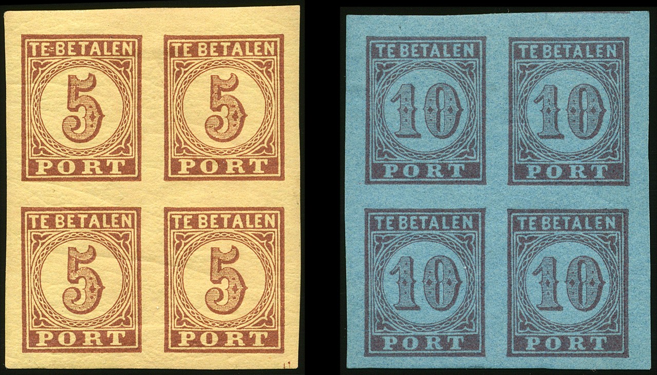 1A en 2, 5 Cent bruin op oranje en 10 cent karmijn op blauw in zeer breed gerande, ongeperforeerde luxe blokken van vier met volle, originele gom, sedert de NVPH editie 1991 beschreven als proeven, die door J.B. Moens uit Brussel in de jaren 1870-75 in de handel zijn gebracht. Desondanks zijn het zeldzame blokken, en zeker in deze kwaliteit. Beide blokken met verouderd cert. ´Koopman, 1977´