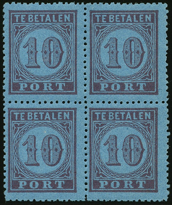 2A, 10 Cent karmijn op blauw in kamtanding 13¼ kl.g. in ongebruikt luxe blok van vier met volle, originele gom, waarvan de onderste zegels postfris zijn en boven in het midden slechts een miniem plakkerspoortje. Slechts een paar blokken bewaard gebleven. Uiterst zeldzaam, en zeker in deze kwaliteit! Cert. ´Koopman, 1977´. € 8500+
