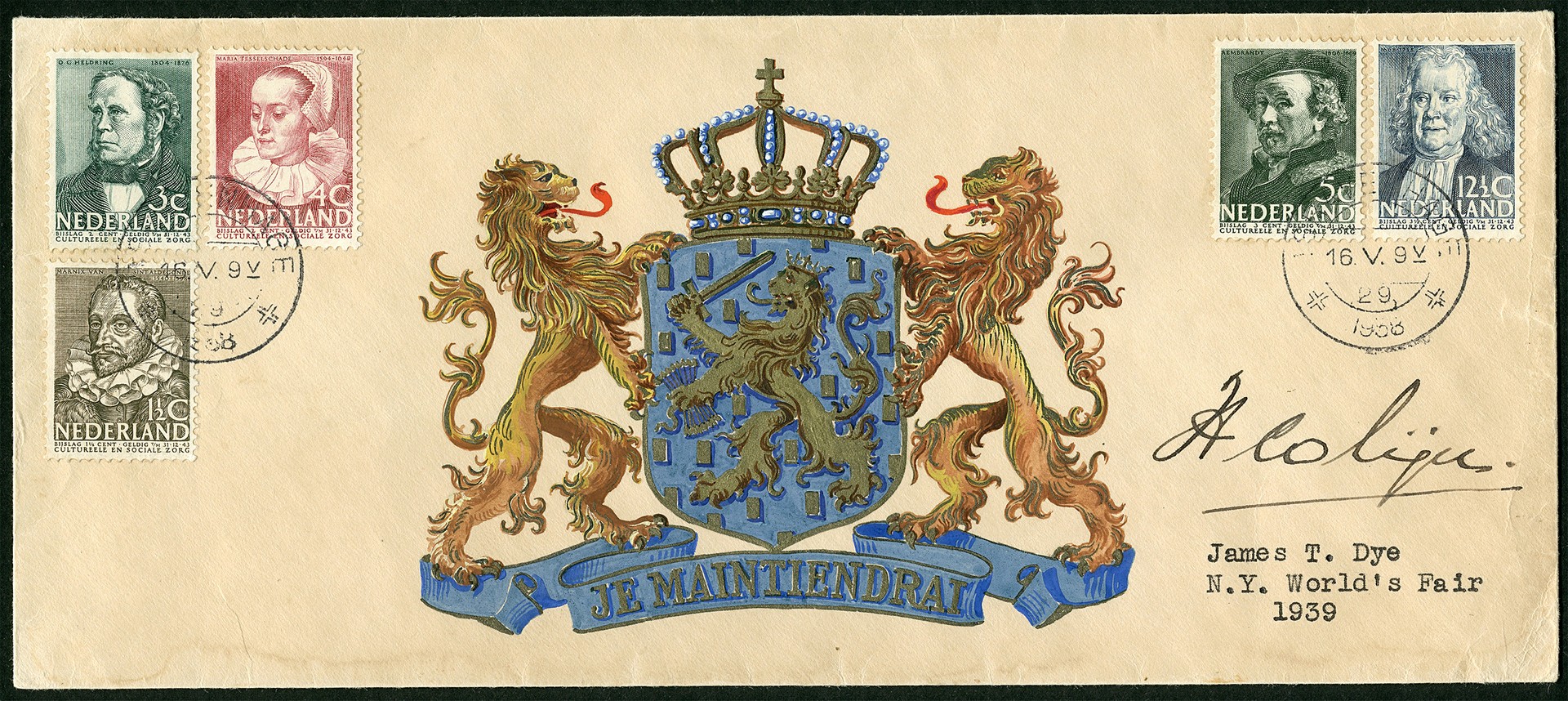 305/09, Zomer 1938, afgestempeld op de eerste dag van uitgifte 16-5-1938, op schitterend couvert met het landswapen getekend en geschilderd door kunstenaar James T. Dye, die het heeft laten signeren door minister-president H. Colijn, en vervolgens heeft geëxposeerd in New York op de World´s Fair van 1939