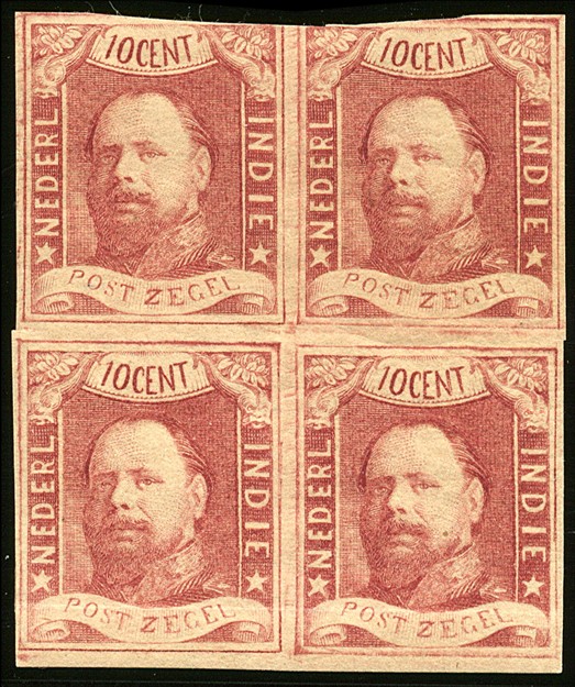 1, 10 Cent wijnrood in vrijwel prachtblok van vier, pos. 16-17/26-27, met volle, originele bruine gom met plakkerresten en ander hechtmateriaal aan de bovenkant. De zegels boven zijn iets aangesneden, overigens fris van kleur. € 1600
