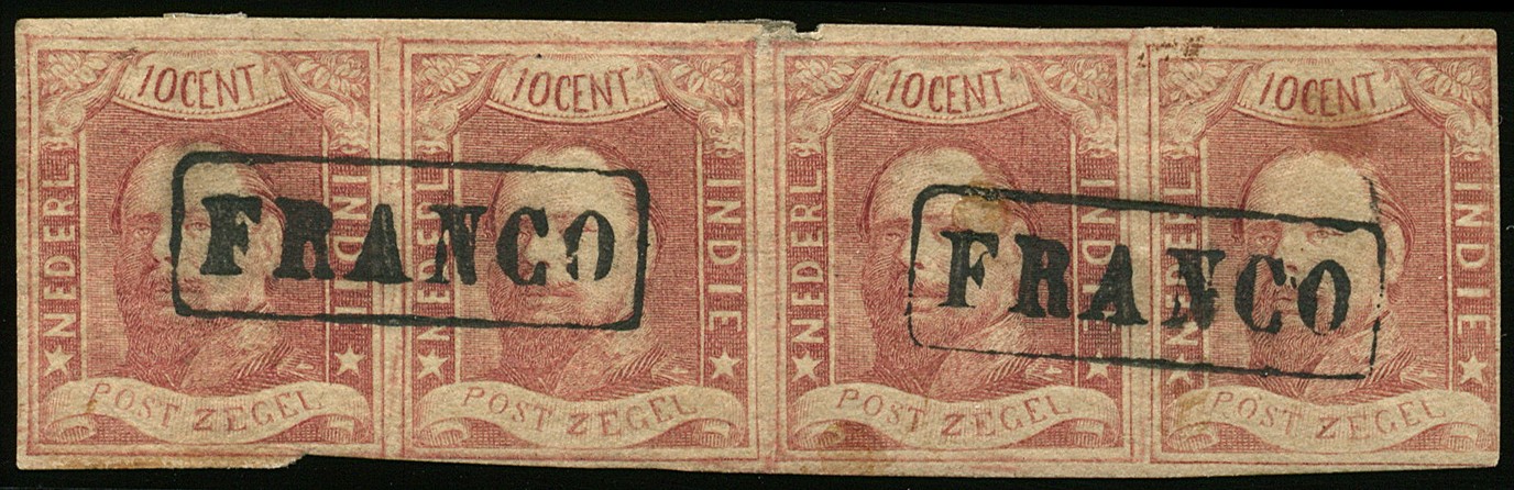 1, 10 Cent in zeer fraaie strip van vier, pos. 77/80, keurig afgestempeld. Ondanks enige gebreken een schaarse eenheid. € 1350