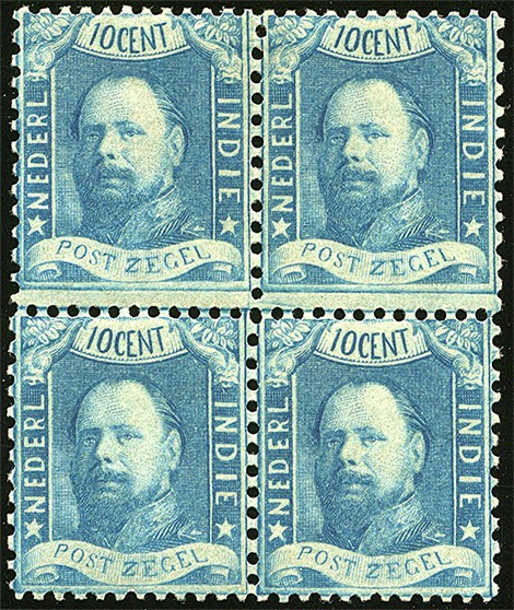 Kleurproef van de 10 cent in blauw, in Kamtanding 12½ x 12 met gom, PC 5a, blok van vier waarvan 2 ex. postfris Hfl.2000 +