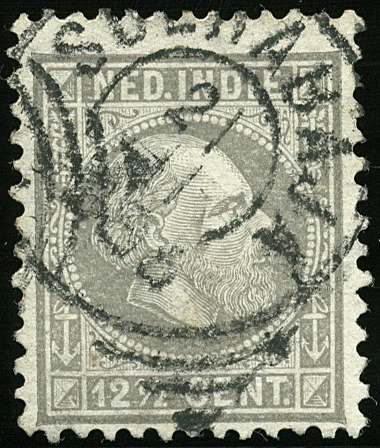 10F, 12½ cent grijs, Kt. 12½ x 12 gr.g., gebruikt zeer fraai ex. (zegel heeft miniem tandscheurtje rechts) met afst. "Soerabaja 21/.1/1886", cert. NVPH (1959) € 2350