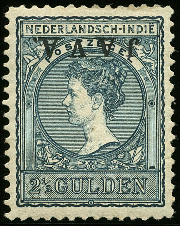 80f, 2½ Gulden zwartblauw met kopstaande opdruk JAVA, licht getint zeer fraai ex. (2 dunne plekjes), met 2 cert. NVPH (1959) en C. Muis (2000) € 3500