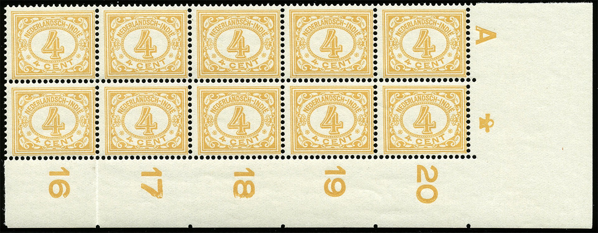 109, 4 Cent geelbruin in postfris pracht hoekblok van tien met op velrand o.a. oplageletter A en drukkersteken. € 550
