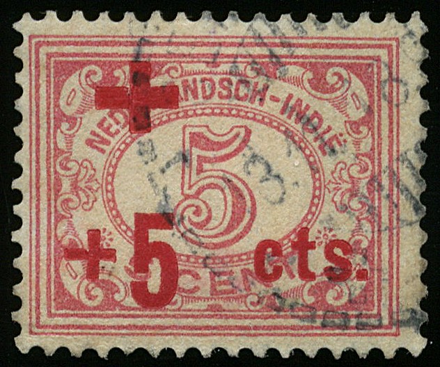 136f, 5 + 5 cts. rode kruis met opdrukvariëteit: afstand tussen plus-teken en cijfer 5: 1 mm i.p.v. 2 mm, gebruikt pr.ex. € 500