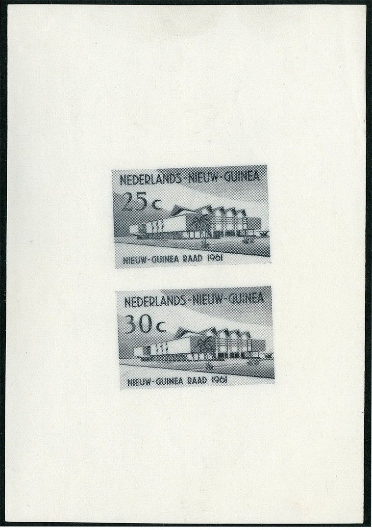 67/68, Compleet tentoonstellingskader betreffende de uitgifte ´Nieuw-Guinea Raad´ van 5-4-1961, inclusief unieke ontwerpen en, volgens voormalige eigenaar F. Bender ´de enig bestaande proefdruk in handen van derden´. Bijzondere koop voor de Nieuw-Guinea specialist! Ex Bender