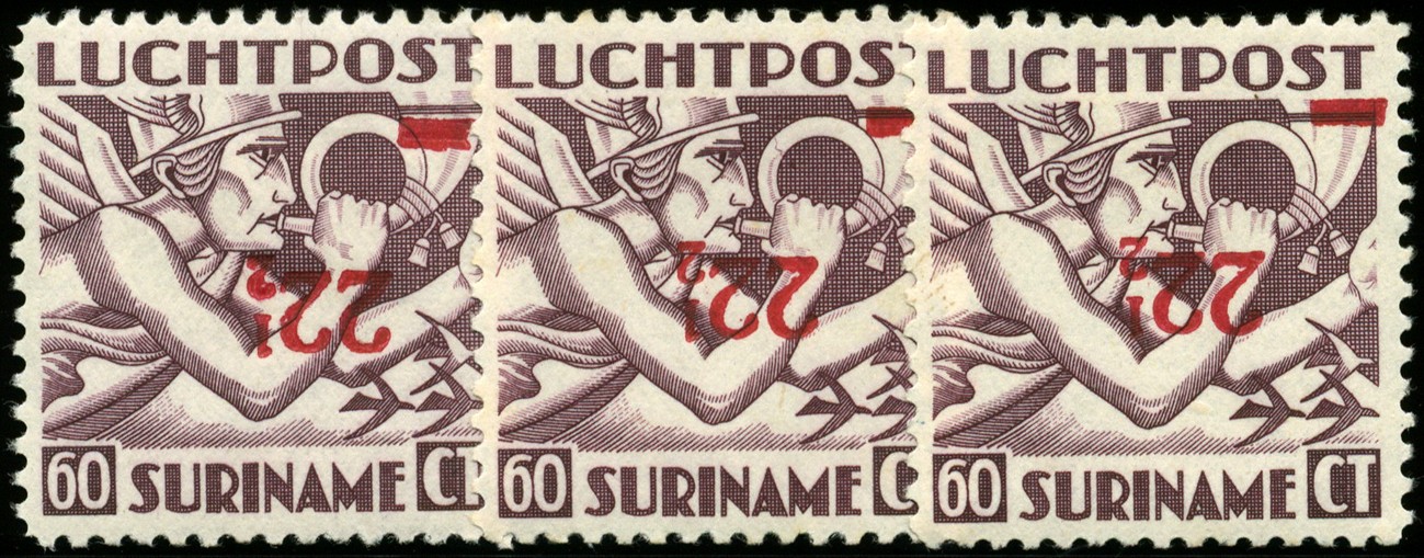 Luchtpost 24fa, 22½ op 60 cent donkerlila, met kopstaande opdruk, drie stuks ongebruikte prachtex., alle met cert. € 1200