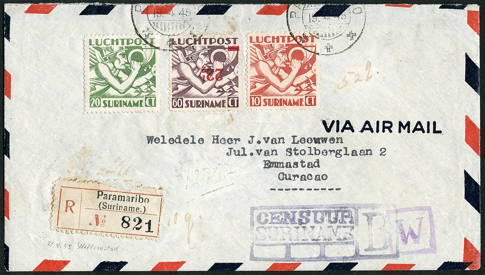 Luchtpost 24fa, 22½ op 60 cent donkerviolet, met kopstaande opdruk i.c.m. LP.1 en LP.15 op aangetekende briefomslag van Paramaribo 19/4/45 naar Curaçao € 400 +