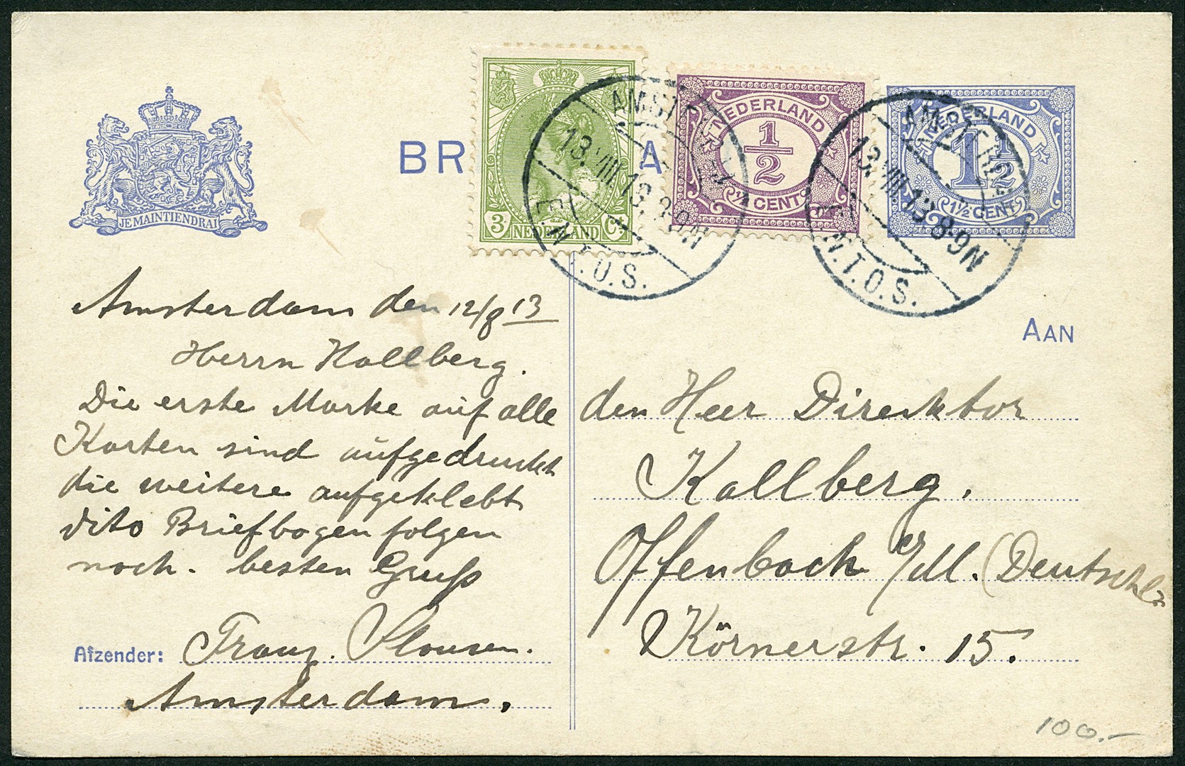 Langebalk Amsterdam / E.N.T.O.S. op prentbk. gefr. met 1c van 16-8-1913 naar Utrecht met machinaal aankomststempel, alsmede 2x op bk. G78-I bijgefr. met nrs. 50 en 57 op 13-8-1913 naar Duitsland. Tevens drie ongebr. prentbk. van de E.N.T.O.S.