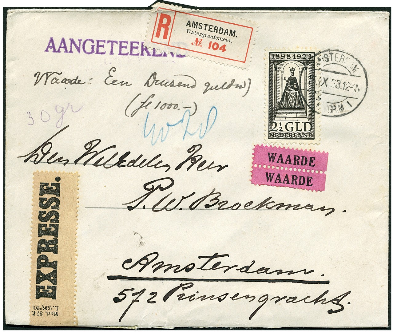 2½ Gulden Jubileum 1923 nr. 130 op env. van 30 gram met aangegeven waarde van 1000 gulden per expresse van Amsterdam- Watergraafsmeer 15-9-1923 naar Amsterdam