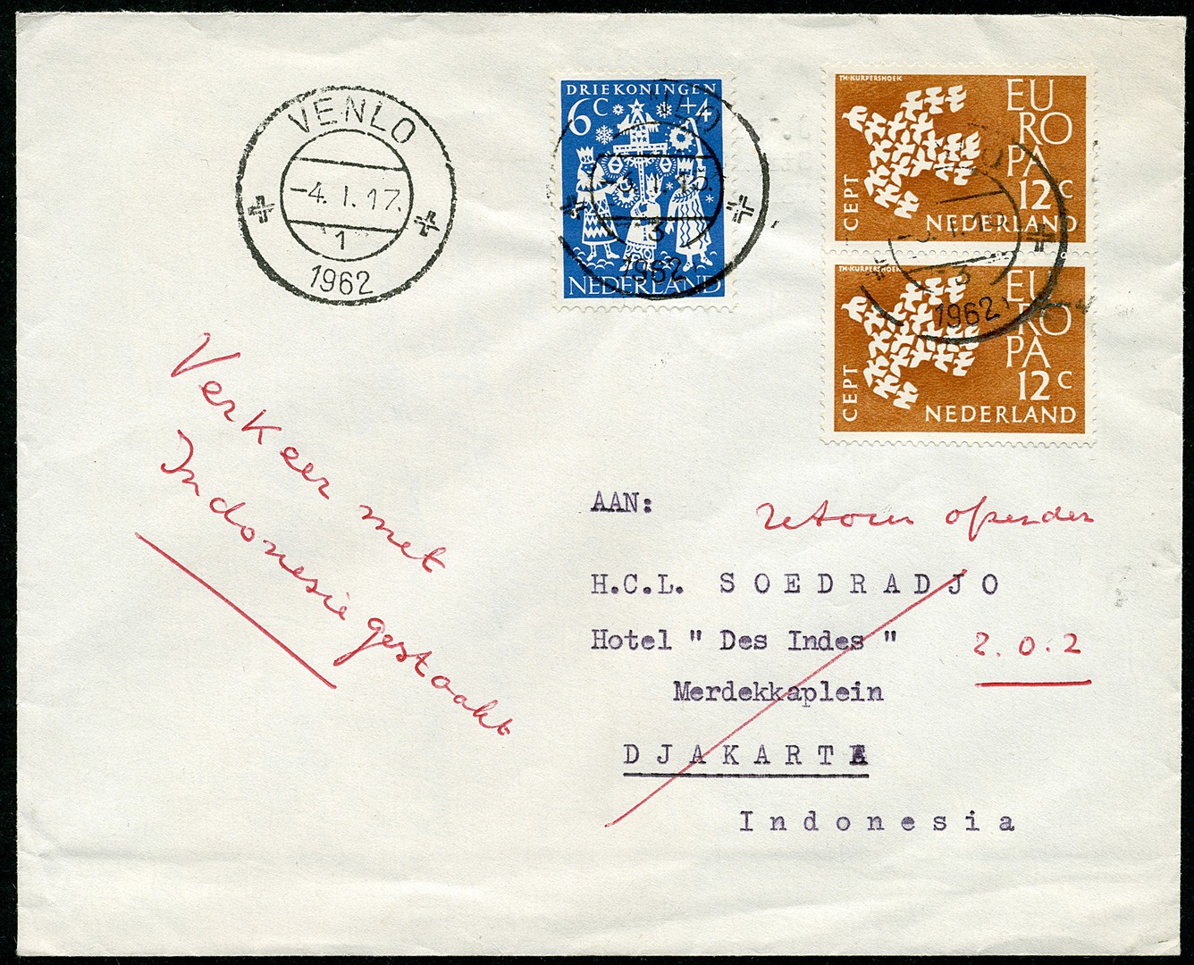 Env. van Venlo 4-1-1962 met bestemming Djakarta, maar 'retour afzender' want 'Verkeer met Indonesië gestaakt'. Nederland en Indonesië stonden op voet van oorlog i.v.m. de Nieuw-Guinea crisis. Historisch!