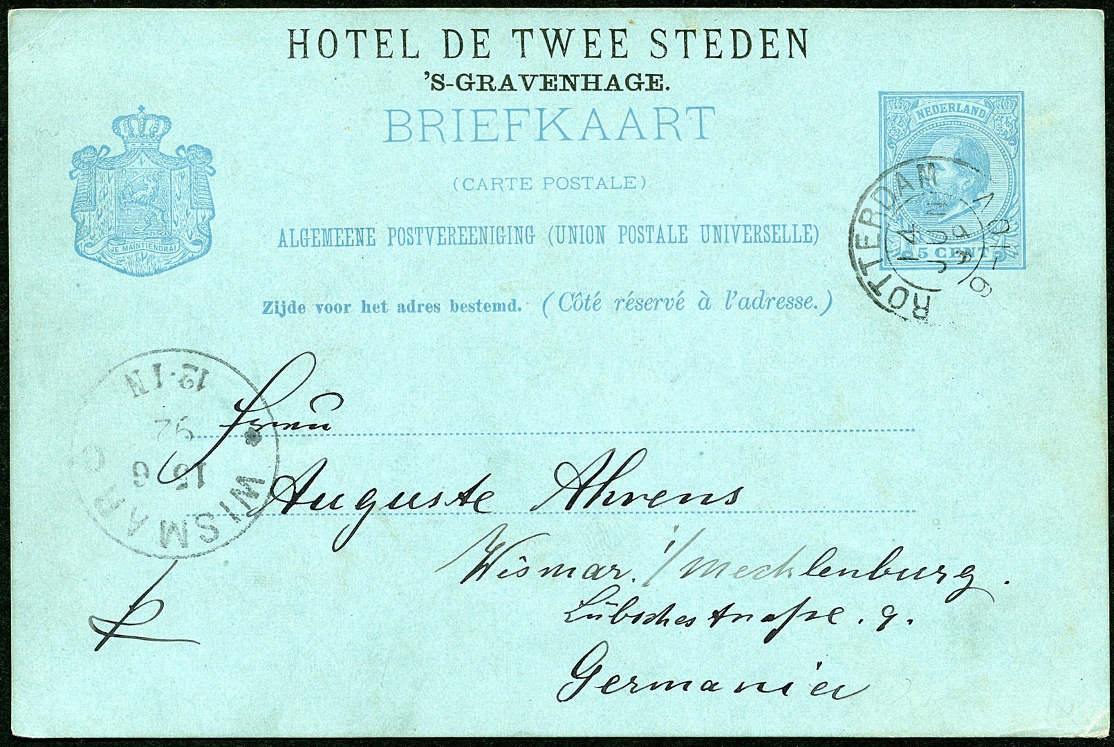 Particulier bedrukte bk. G27 (az. met opplaksporen) met zwarte druk ´HOTEL DE TWEE STEDEN/´s-GRAVENHAGE.´ van Rotterdam 14-6-1892 naar Wismar 15-6