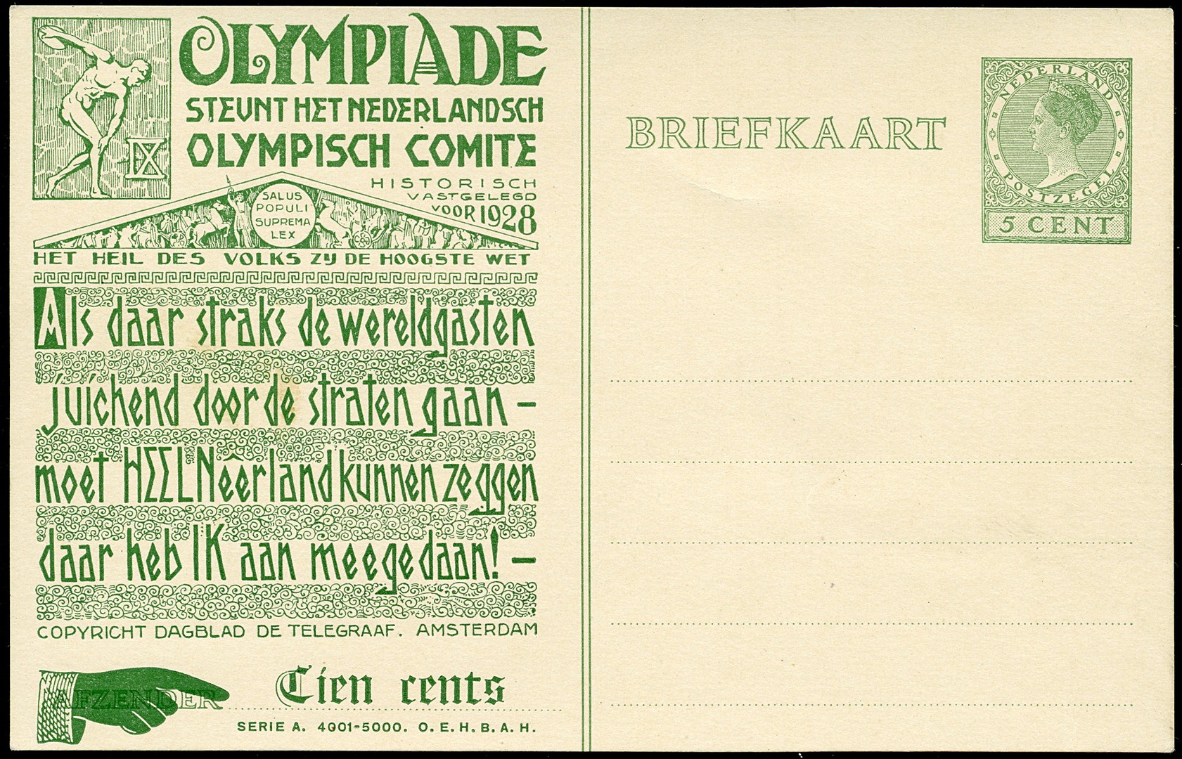Particulier bedrukte bk. Olympiade 1928, OL13. Ongebruikte prachtkaart