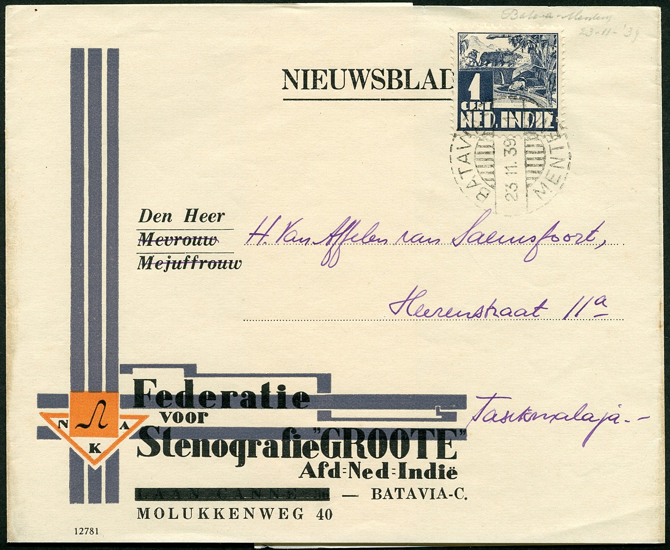 Decoratief omslagbandje voor een nieuwsblad, gefr. met 1c Kreisler nr. 186 van Batavia-/Menteng 23-11-1939 naar Tasikmalaja. Schaars, ook het poststempel (SvL 150)