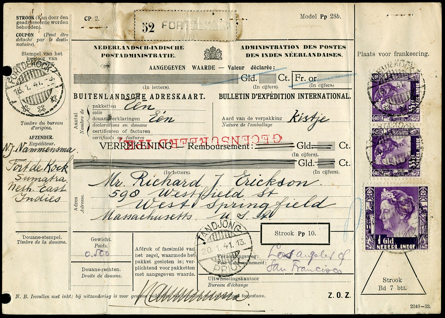 Buitenlandse adreskaart gefr. met 35c in paar en 1 gld voor de verzending van een kistje van Fort de Kock 16-1-1941 over Tandjong-/Priok 20-1 naar de USA. Tevens met bijbehorende douaneverklaring waarop specificatie ´Twee geschilderde houten poppen en een zilveren Atjeh-hangertje´. De formulieren hebben links perforatiegaten, de adreskaart heeft een rood censuurstempel ´GECENSUREERD TPK´ (TPK = Tandongpriok). Uiterst zeldzaam, door ons nog geen 2e afdruk van gezien!