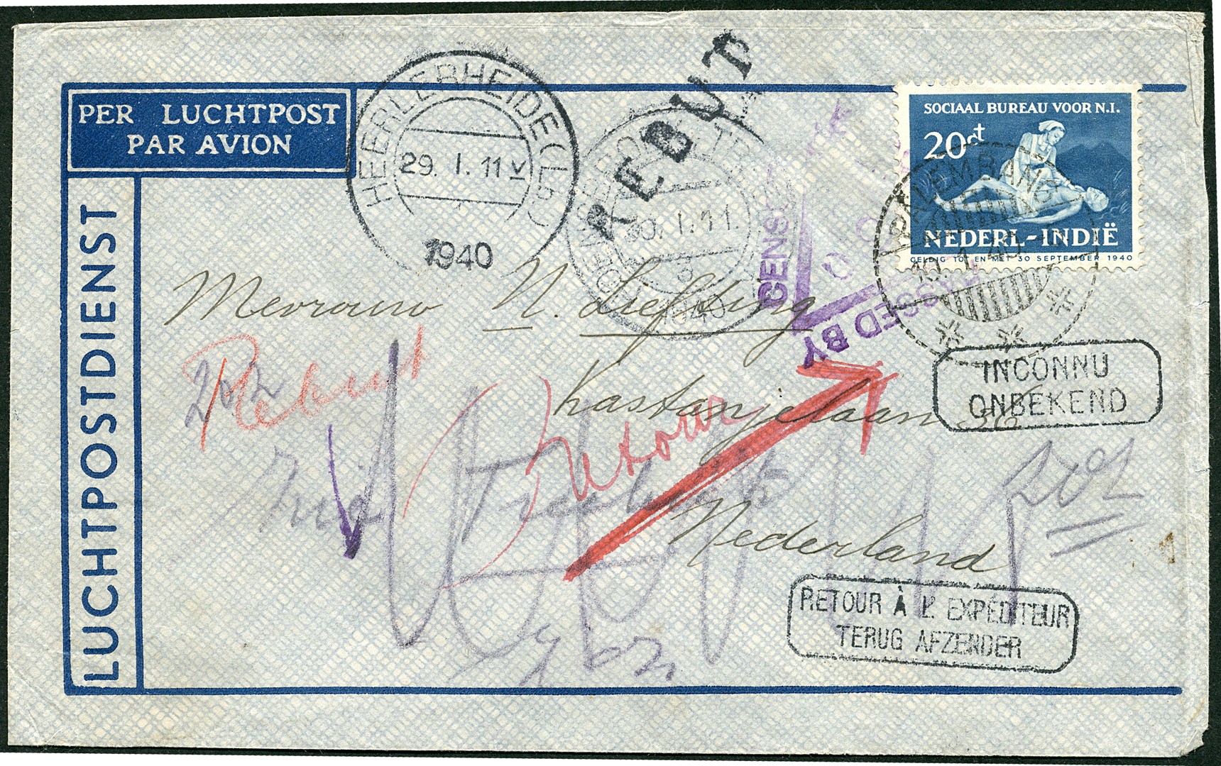 Luchtpostcouvert gefr. met 20c Sociaal Bureau verz. naar geadresseerde zonder plaatsnaam, daarom op vz. en az. vele notities en stempels, interessant poststuk! Tevens met Kreisler- en van Konijnenburgzegels gefr. en gecensureerd luchtpostcouvert van Madioen 1-6-1941 naar Engeland