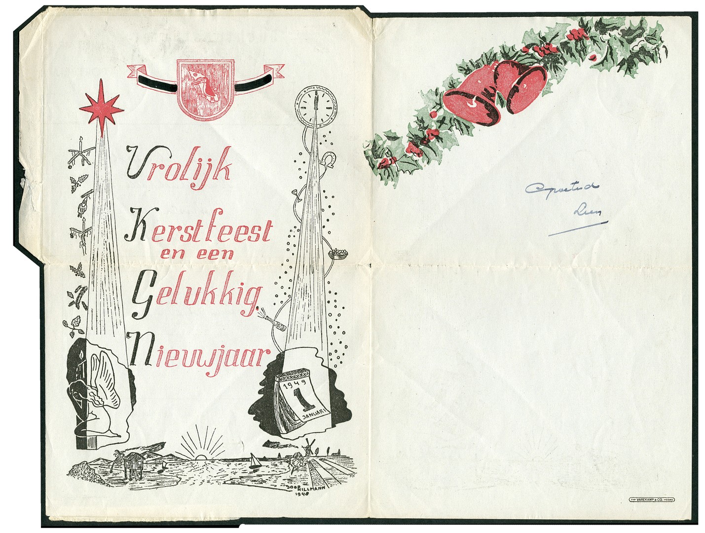 Militair luchtpostblad G8 met aan de binnenzijde zwarte, rode en groene druk ´Vrolijk Kerstfeest en een Gelukkig Nieuwjaar´, ontwerp Joop Hillmann, 1948, afgest. Veldpost-Medan 18-12-1948