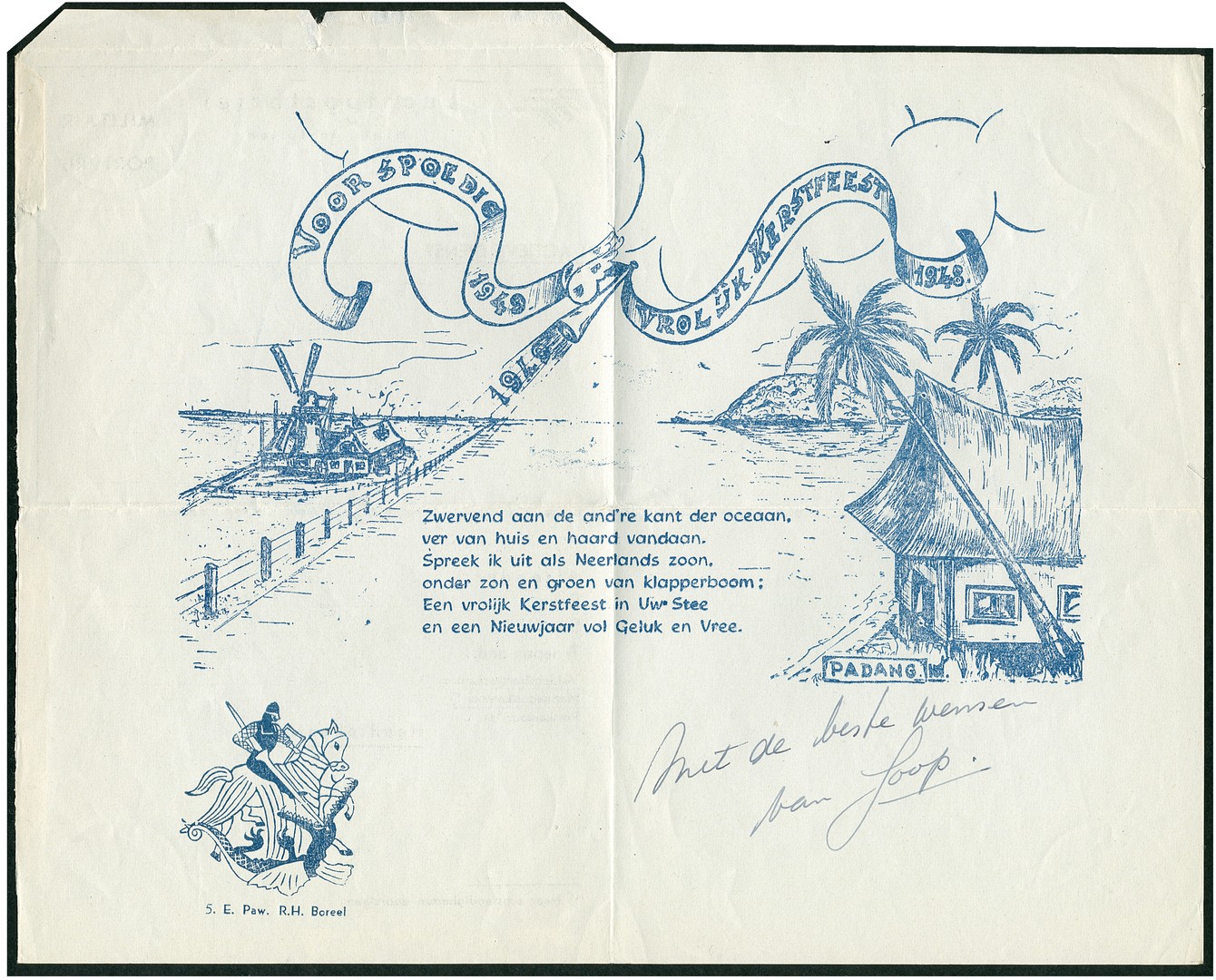 Militair luchtpostblad G9 met aan de binnenzijde blauwe druk ´Voorspoedig 1949. Vrolijk Kerstfeest 1948. Padang´ met St. Joris en de draak, Hintzen/De Baar Rc, afgest. Veldpost-Padang 17-12-1948