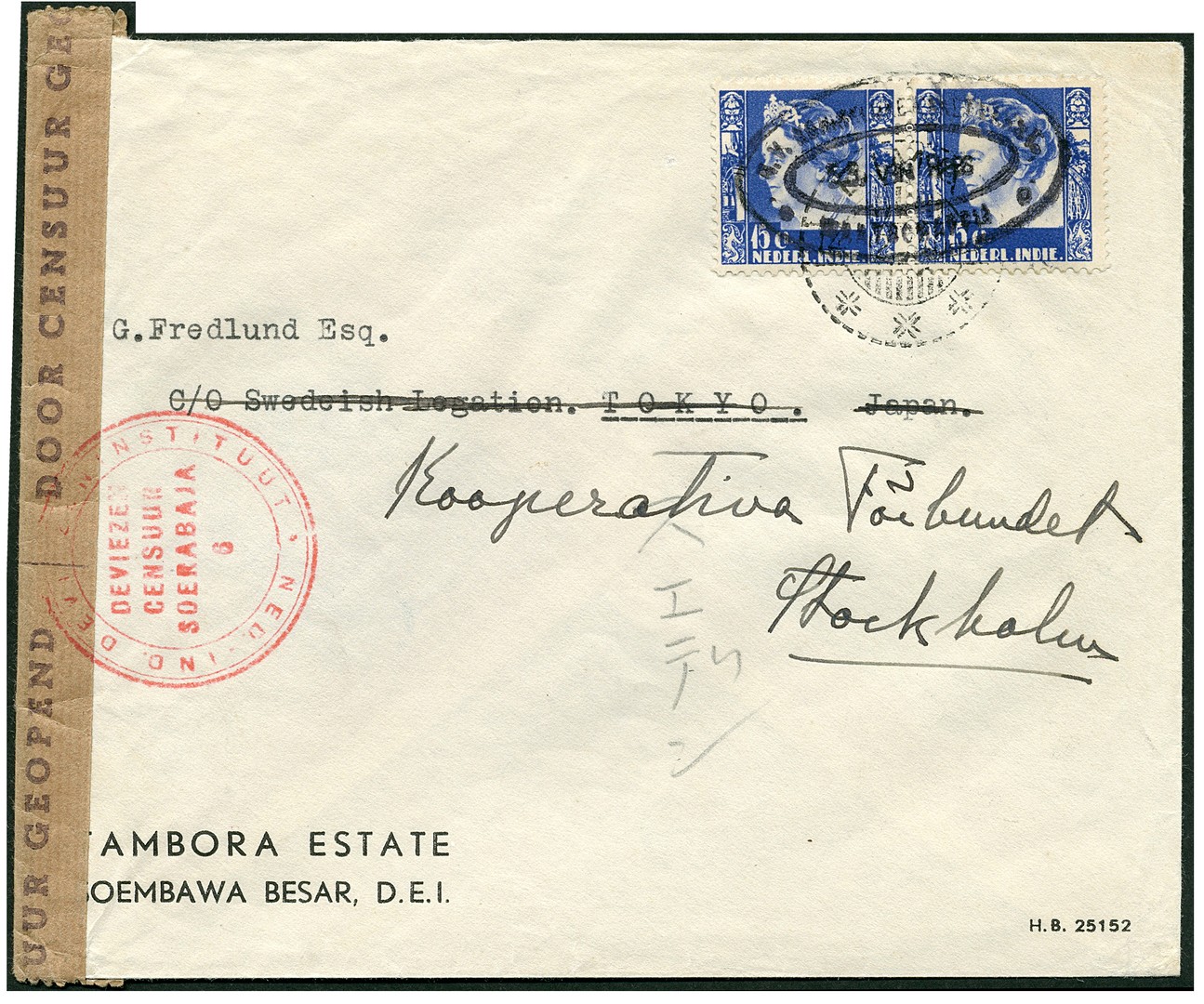 Gecensureerde env. gefr. met 15c in paar afgest. met KPM-ovaalstempel ´S.S. Van Rees´ via Bima 14-2-1940 naar Tokyo, doorgez. naar Stockholm