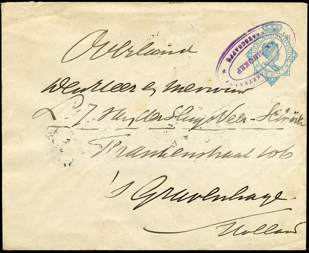 Env. (iets minder mooi) van 20c uit Djambi afgest. met KPM-ovaalstempel ´s.s. SINGKEP´ met op az. Paquebot Singapore 23-3-1925 naar Den Haag. Zeldzaam KPM-stempel!
