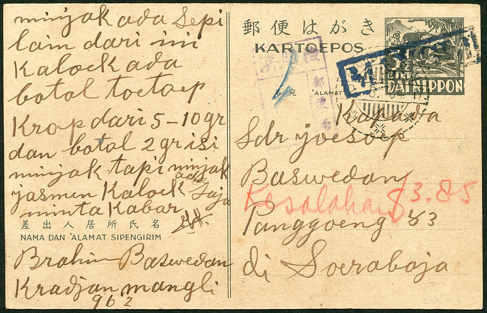 Java. MANGLI train-halt pmk in blue on censored 3½c postcard Bu.J11 via Rambipoedji 12.6.04 to Soerabaja