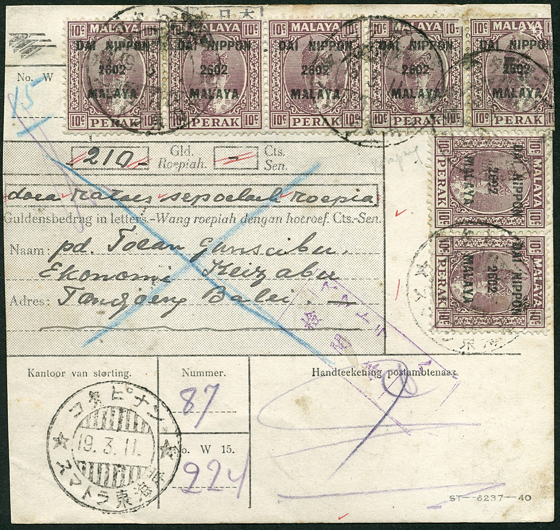 Sumatra. East Coast. M11 (7 on front, 3 on the reverse) on M.O. Bu.JF1a from Kotapinang 19.3.11 to Tandjongbalei 19.3.15. Because stamps with the Queen were not allowed in the East Coast, stamp shortage appeared, hence ten 10c Malayan stamps were used