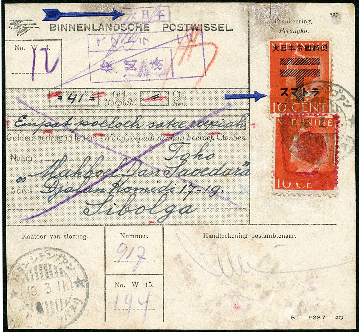 Sumatra. Tapanoeli. 10 Cent van Konijnenburg with Hinomaru overprint no. 221r-43II and with machine T overprint no. 922z-43II on slightly smudged M.O. Bu.JF1a showing framed Dai Ni Hon overprint 821v from Padangsidempoean 19.2.12 to Sibolga 19.3.14. Censor Bu.JC15