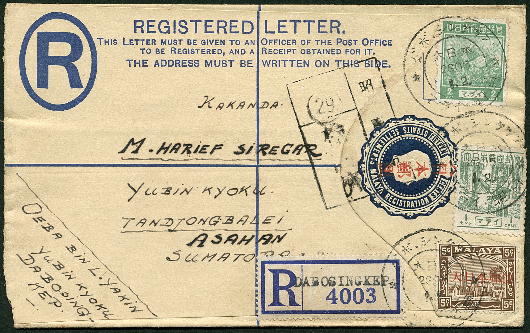 Sumatra. Riouw Islands (Lingga Archipelago). Straits Settlements 15c Registered envelope overprinted in red with Dai Ni Hon Yubin and franked with additional 1c and 2c Malaya occupation definitives and 5c Selangor with red Dai Ni Hon Yubin overprint (RRR for usage in the Indies!) is 8 cents to make the new 23 cents rate for registered mail. Sent from Dabosingkep 2605 1.2. (2 Jan 1945) via Syonan (Singapore) 2605 2.9. (9 Feb 1945) to Tandjongbalei (in Asahan, Sumatra) 20.3.-9. (9 March 1945). The Registered Letter was not used in the Dutch East Indies, usage in the Riouw Islands during the war makes it quite unique. Showpiece of every important Japanese occupation collection and an exhibition piece of the highest calibre