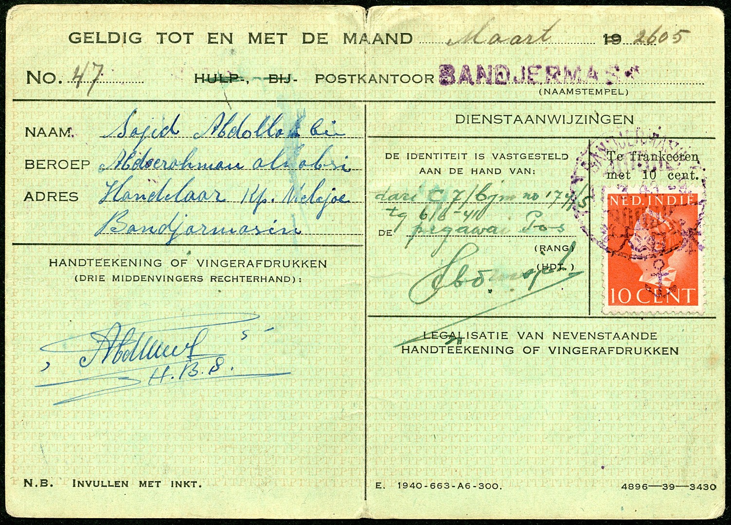 Borneo. Identity card Bu.JF56 bearing 10c Van Konijnenburg with violet SE Borneo anchor 212v, used at Bandjermasin 17 March 1943. Only three identity cards known from the Navy occupied area, this is the only one from Borneo. RRR