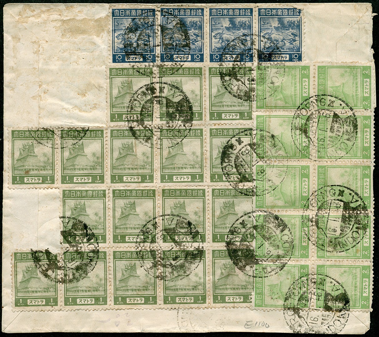 Sumatra. Envelope of recycled paper bearing on the back Sumatra Definitives Japanese Occ. 1 cent no. 01 (17x), 2 cent no. 02 (10x) and 10 cent no. 07 (4x) (probably 4 stamps missing), tied Taroetoeng 16.1.46 and on the front a Medan registration label with red pencil changed into ´trt´ from Taroetoeng. Rare cover!