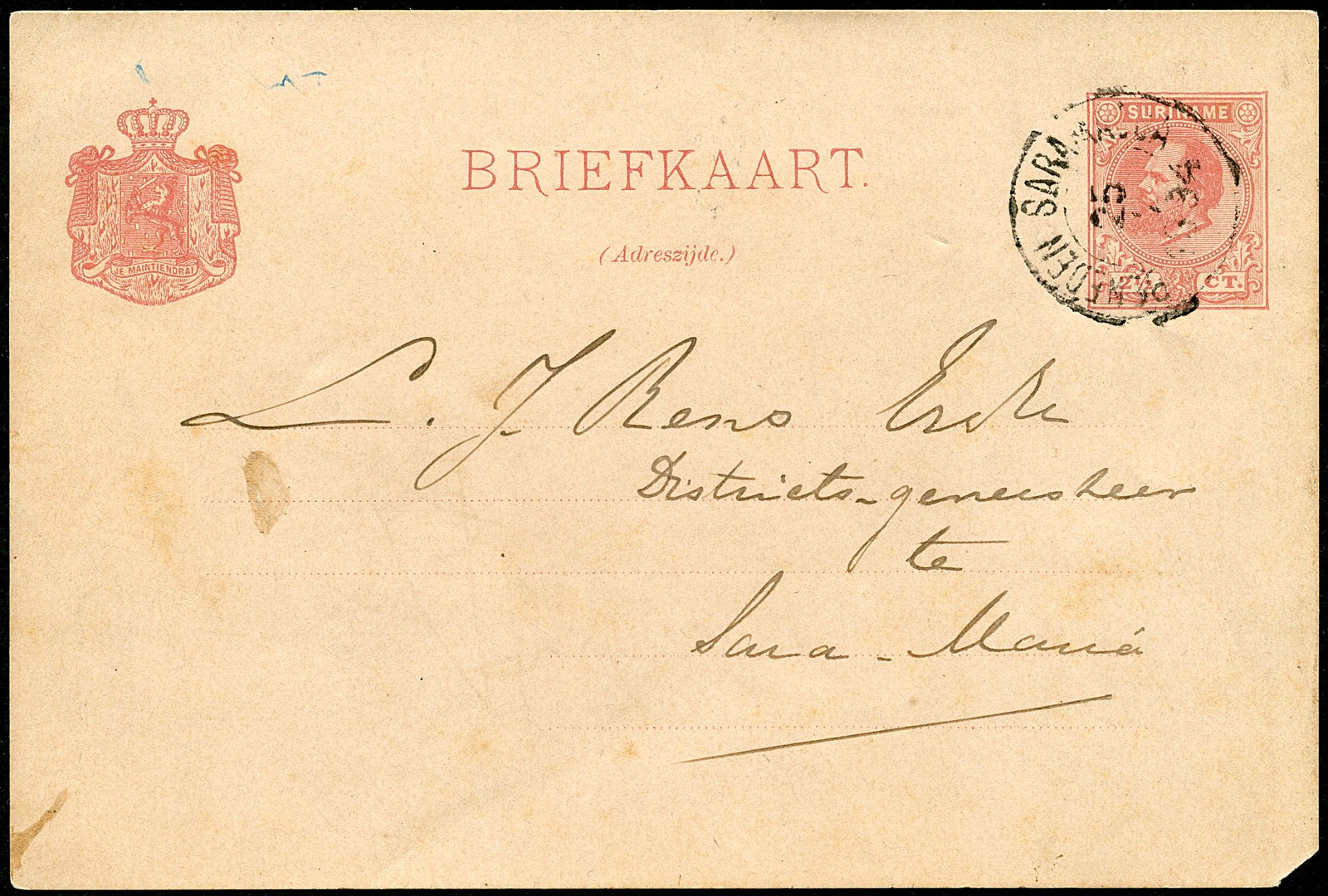 Bk. G7 (mist hoekje) geschreven te Paramaribo, verz. naar een districts-geneesheer te Saramacca, afgest. in zwart met zeldzaam kleinrond Beneden Saramacca 25-7-1894 ES.type 1Aa