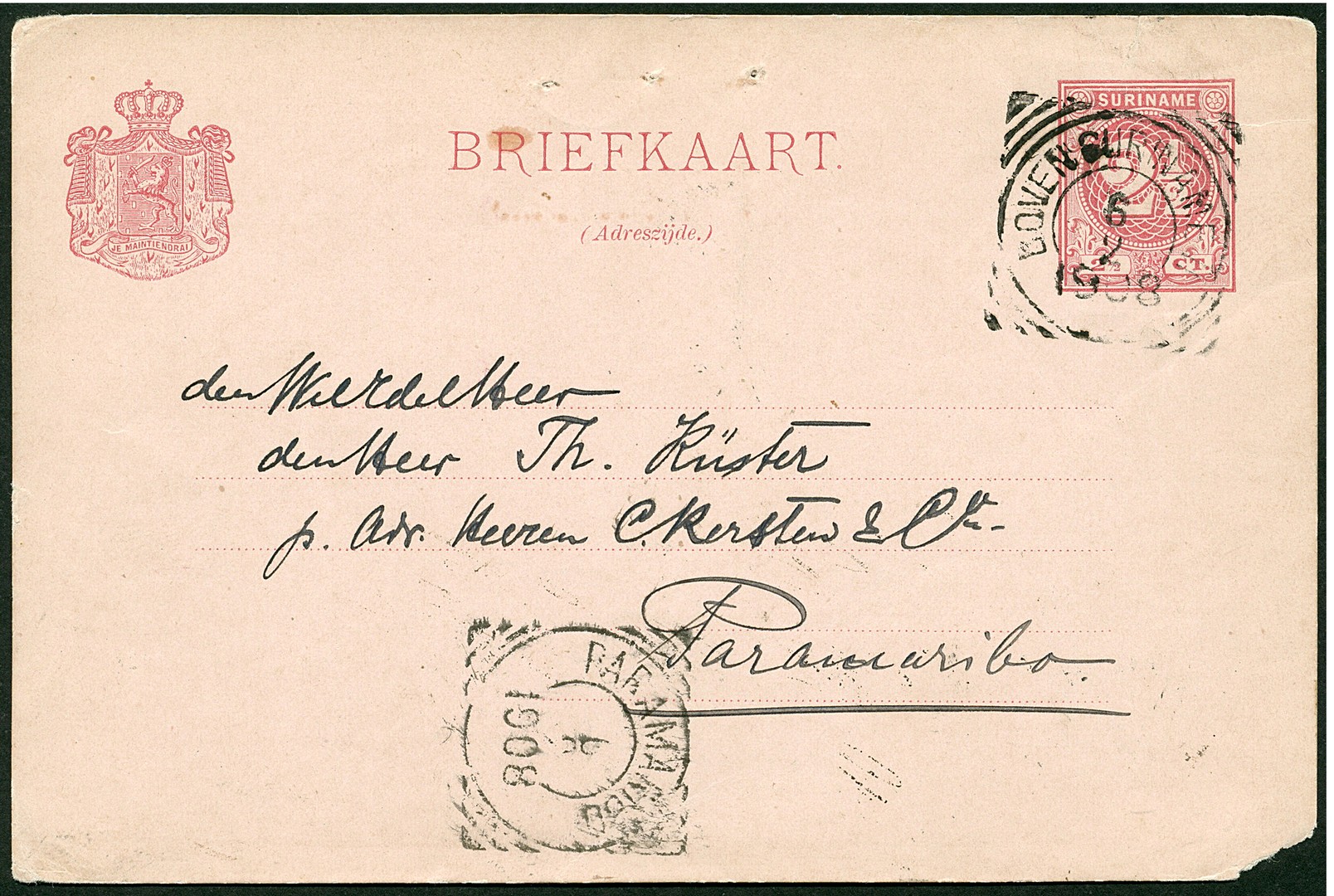BOVEN SURINAME II op iets minder mooie bk. G11 geschreven door leraar P. Hellström van de kerk in Domburg, op 6-2-1908 naar een geadresseerde bij de fa. Kersten te Paramaribo 6-2. Uiterst zeldzame afdruk van dit rivierbootstempel, waarvan dit waarschijnlijk pas het tweede bekende exemplaar is (zie: ES. deel I, blz. 100, type 2B)