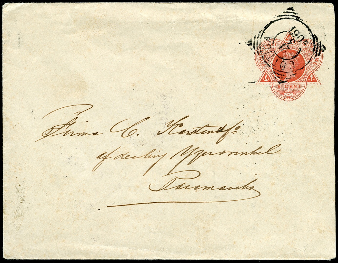 COTTICA op env. G1 van 21-3-1905 via rivierbootdienst Ben: Commewijne 21-3 naar de fa. Kersten te Paramaribo 21-3. Mooie afdruk waarin het jaartal kopstaand in het stempel staat, wat nog niet in de literatuur is beschreven (zie: ES. deel I, blz. 102)